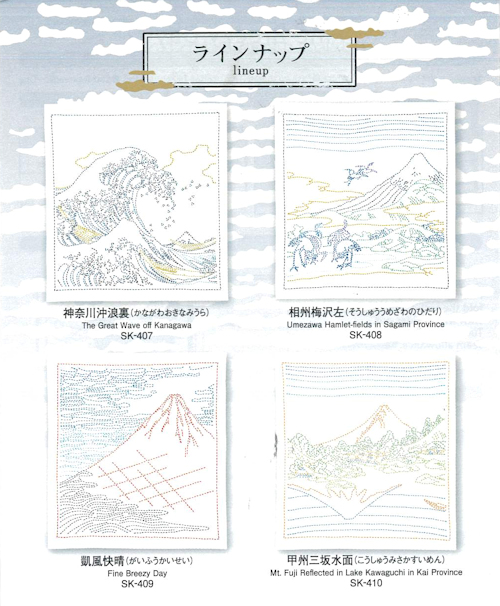 新しくなった日本のパスポートにもデザイン採用され注目された葛飾北斎の浮世絵「富嶽三十六景」を刺し子で表現しました。