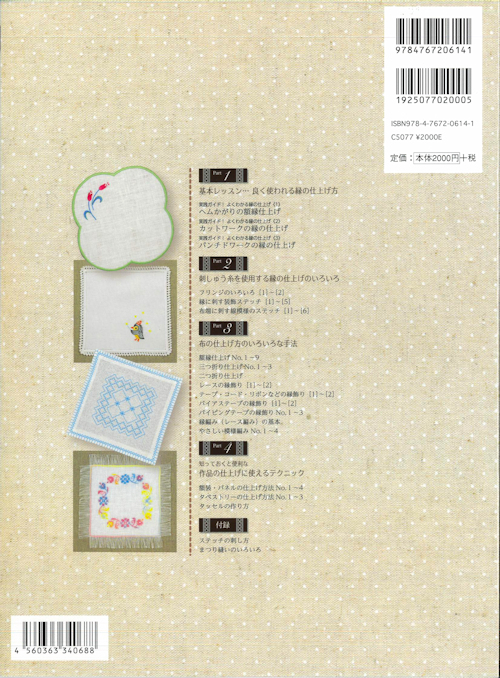 布物の縁の仕上げ方を、基本的な方法から刺しゅう作品を仕上げる際によく使われる手法まで、プロセス写真と図をあわせて掲載し、わかりやすく解説しています。作品づくりに大いに役立つ1冊です。