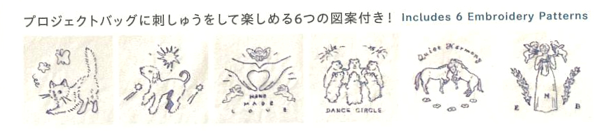 図案の写し方から刺しゅう糸の扱い方、基本の刺しゅうのステッチの仕方まで詳しく書かれた詳しい説明書付き。プロジェクトバッグに刺しゅうできる6つの図案も付いています。刺しゅう糸は1つの図案が刺せる分量が入っています。