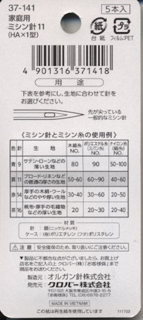 [9154] クロバー 家庭用ミシン針11 普通地用[37-141]